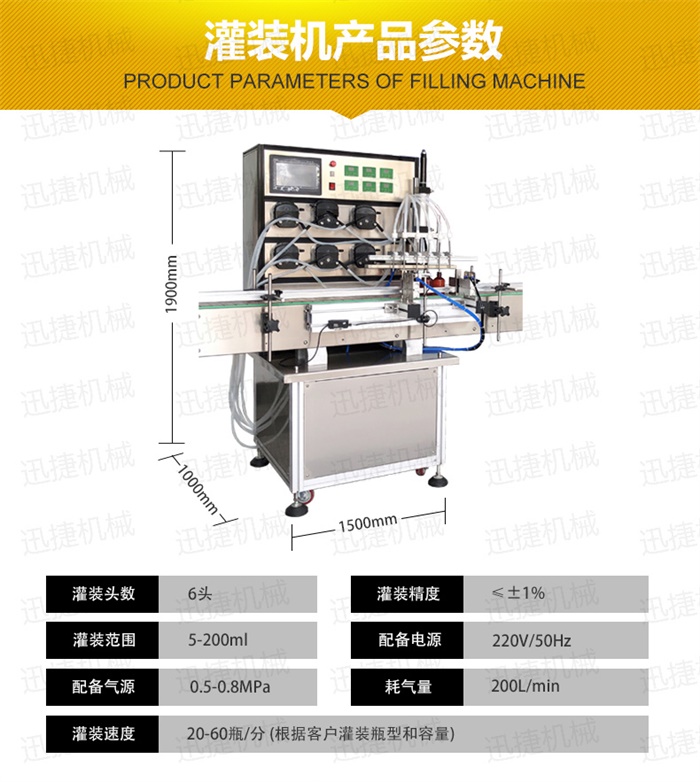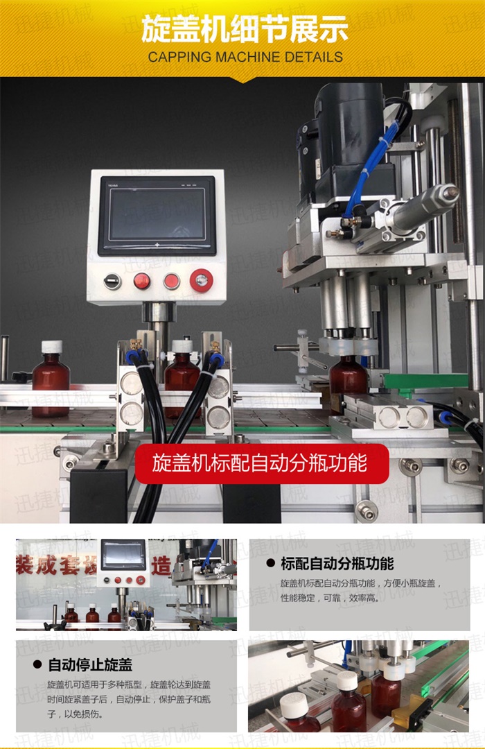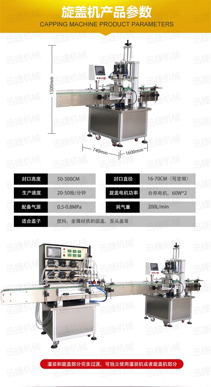 工作流程:液体灌装头自动定位定量灌装,机器灌装完成1-10升的灌装,随即进入下一个工位,震盘自动理盖,自动上盖,自动旋紧瓶盖。整个生产过程只需要人工放空桶。提升工作效率,降低劳动强度。