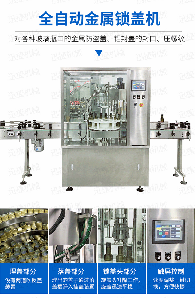 本设备适用于食品、化妆品、化工等行业,主要针对各种玻璃瓶口的金属防盗盖铝封盖的封口、压螺纹等。该设备可单机使用,也可以与灌装机等设备组成生产流水线自动作业;
