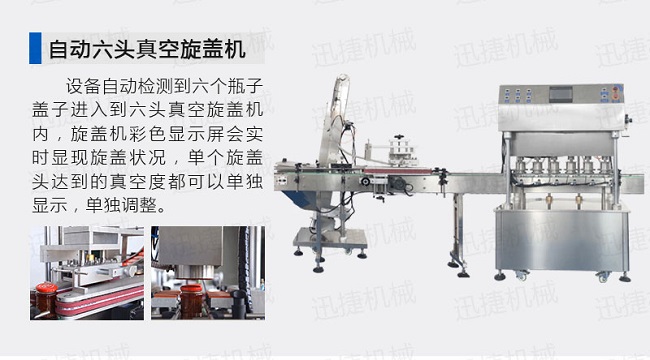 该直线式真空旋盖机是结合用户使用的情况,摒弃了传统转盘式真空旋盖机的弊端,研制开发的设备,设备自动检测到六个瓶子盖子进入到六头真空旋盖机内,旋盖机彩色显示屏会实时显现旋盖状况,整机多点检测,当进口无瓶无盖、出口堵塞、定位不准、瓶身倾倒均自动?;?。单个旋盖头达到的真空度都可以单独显示,单独调整!