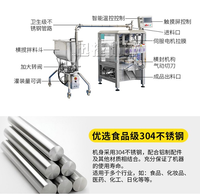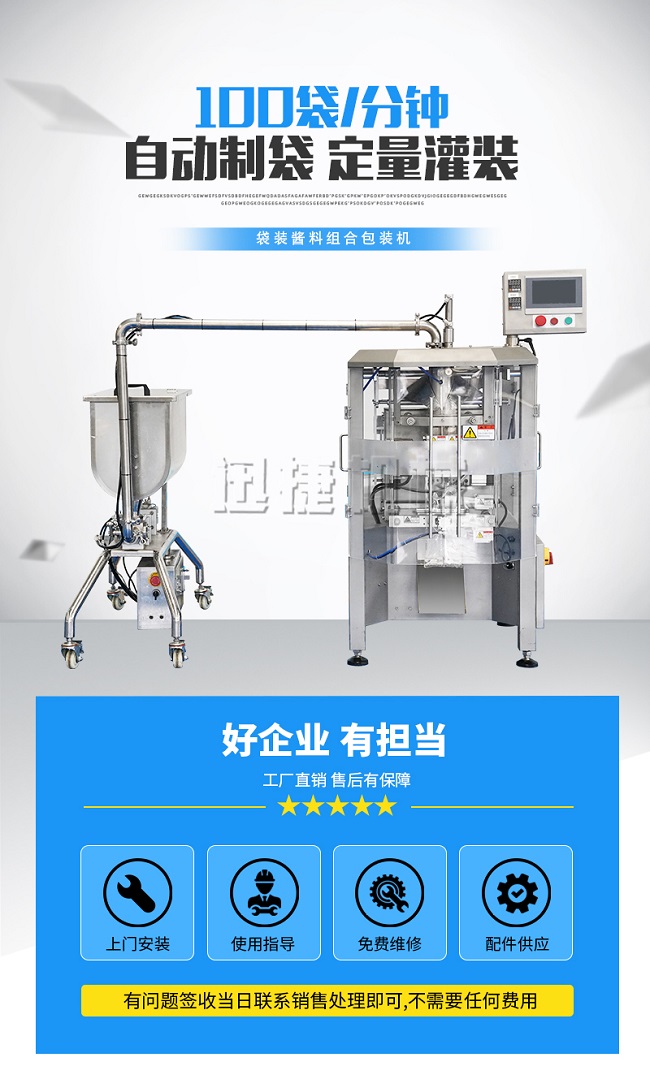 本机器主要用于调味品酱料的自动化包装,机器安装有横向螺带式搅拌,使油酱混合均匀,确保灌装精度和产品包装成品的均匀性。灌装计量设备安装有万向轮,管路链接均采用快拆接头,方便灌装机拆卸移动清洗。包装设备采用全伺服驱动器,包装速度快,运行稳定。设备构成组件:搅拌式定量灌装机一台管道链接组件2米。