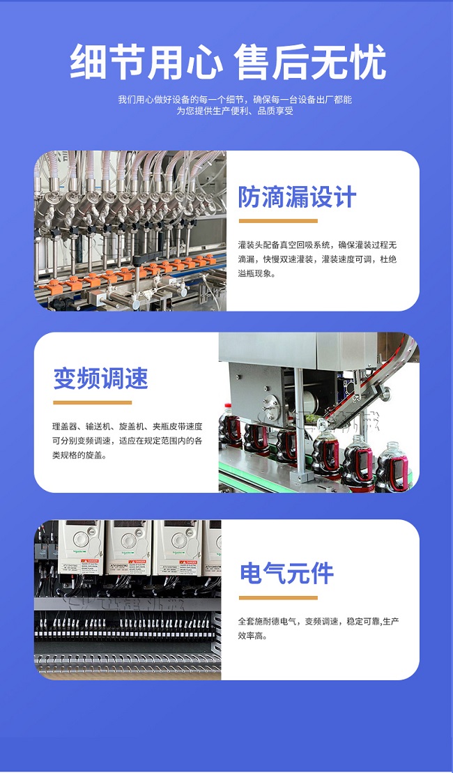 本机适用于多种材质,多种几何形状的容器,如塑料片、玻璃瓶、金属瓶等;在需要更换瓶或盖的时候,只要调整部分零件的位置即可,无需更换任何配件;在旋盖过程中可以做到无瓶不下盖。理盖器、输送机、旋盖机、夹瓶皮带速度可分别变频调速,适应在规定范围内的各类规格的旋盖。(附:特殊规格定制即可)