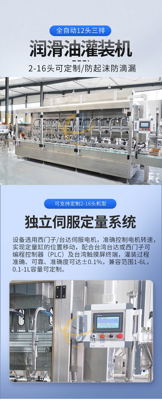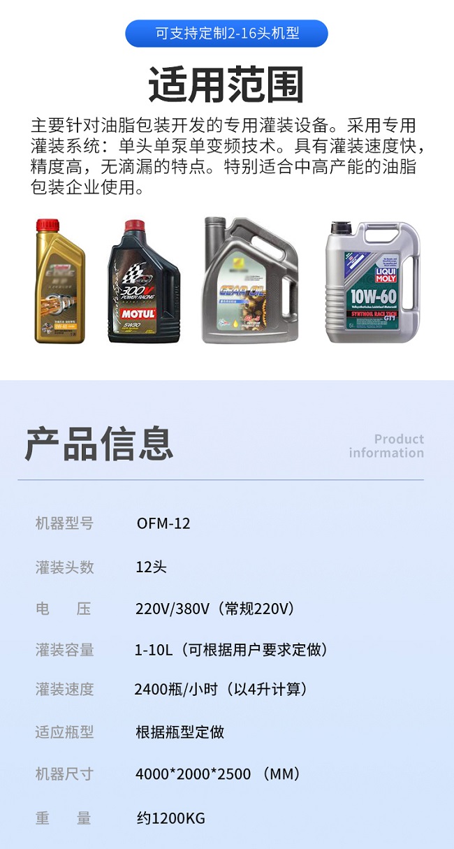 这款全自动十二头三排润滑油灌装机是本公司专为润滑油厂家研发的自动化设备,这款润滑油灌装机2-16头可定制,防起沫防滴漏。主要针对油脂包装开发的专用灌装设备。采用专用灌装系统:单头单泵单变频技术。具有灌装速度快,精度高,无滴漏的特点。特别适合中高产能的油脂包装企业使用。