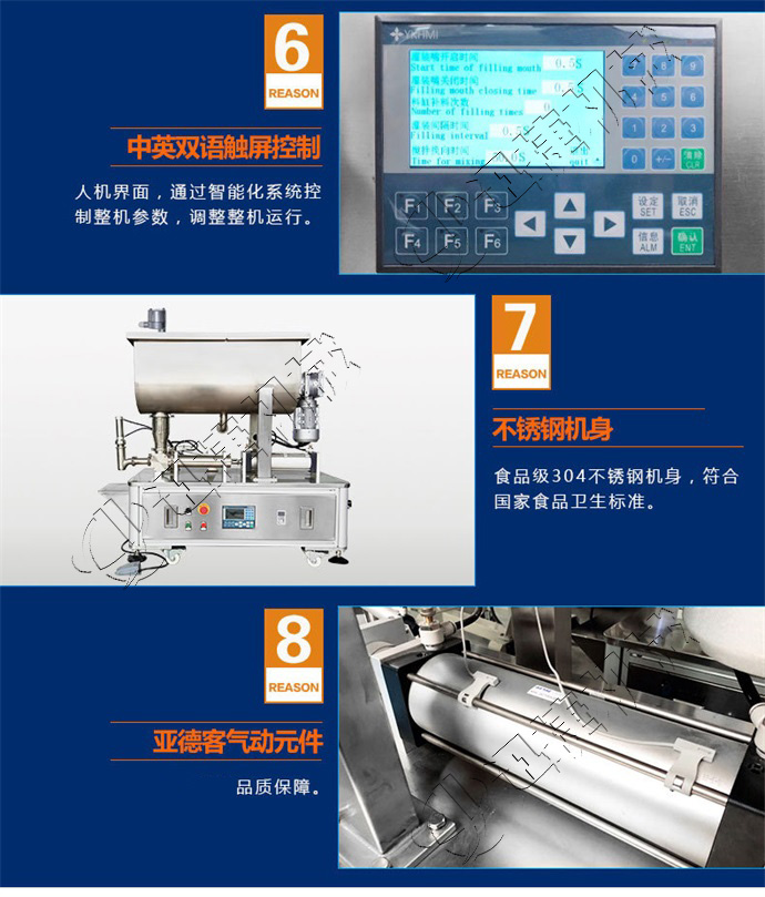 该半自动辣椒酱灌装机适合于将各类粘稠体及含有各种固体物质如辣椒、花生、肉块、佐料等物体的酱类和油、料分离的火锅底料等灌装于各种容器中,适用于辣椒酱、颗粒酱料、大块肉酱、火锅底料等酱体的灌装。