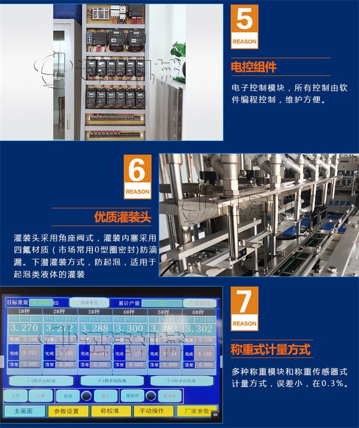机适用于对流体5kg-30kg的计重量灌装。自动完成计数进瓶、计重量灌装、输送出瓶等一系列操作。 特别适用于水剂、食用油,润滑油的定量灌装,是食品,医药,化妆品以及精细化工等行业的包装机。本机采用可编程控制器(PLC)、高速工控组态软件进行实时监控的控制,使用调节方便。整机按GMP标准要求制作,各管路连接采用快装方式,拆卸清洗方便,与物料接触部位及外露部位均采用优质不锈钢制造。整机安全、环保、安全、美观、能适应各种不同环境工作。