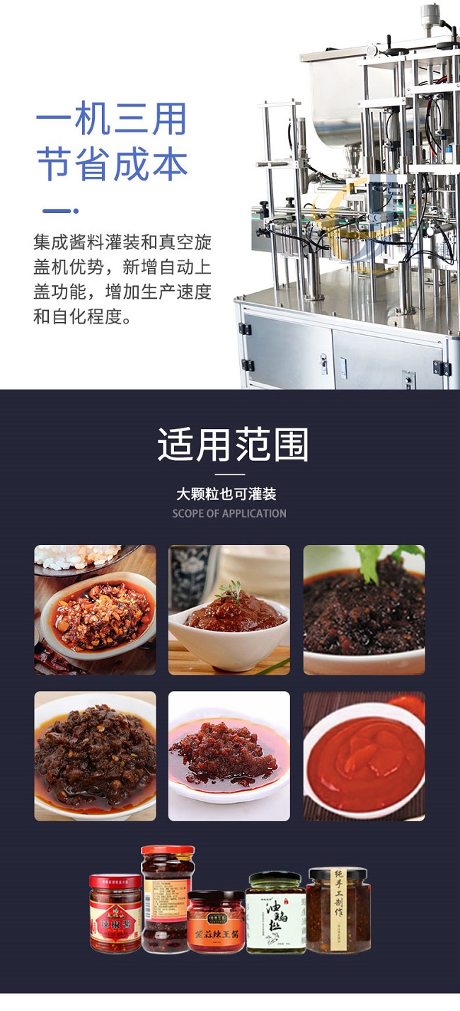 现在的生活节奏也比较快,牛肉酱也比较方便购买,网上、超市都有的售卖,所以许多的商家开始与全自动牛肉酱灌装机厂家直销进行合作,全自动牛肉酱灌装机您知道如何选购吗?这时候在灌装颗粒比较大或者比较粘稠或比较干的酱料的时候,我们全自动牛肉酱灌装机采用柱塞式进行计量,保证定量准确可靠,可用于多种瓶型,换瓶型只需要更换一套模具,模具更换的时间约为15分钟左右,为了迎合社会发展的主题,全自动牛肉酱灌装机效率高,帮助了很多企业解决了人工难题也更受消费者欢迎。