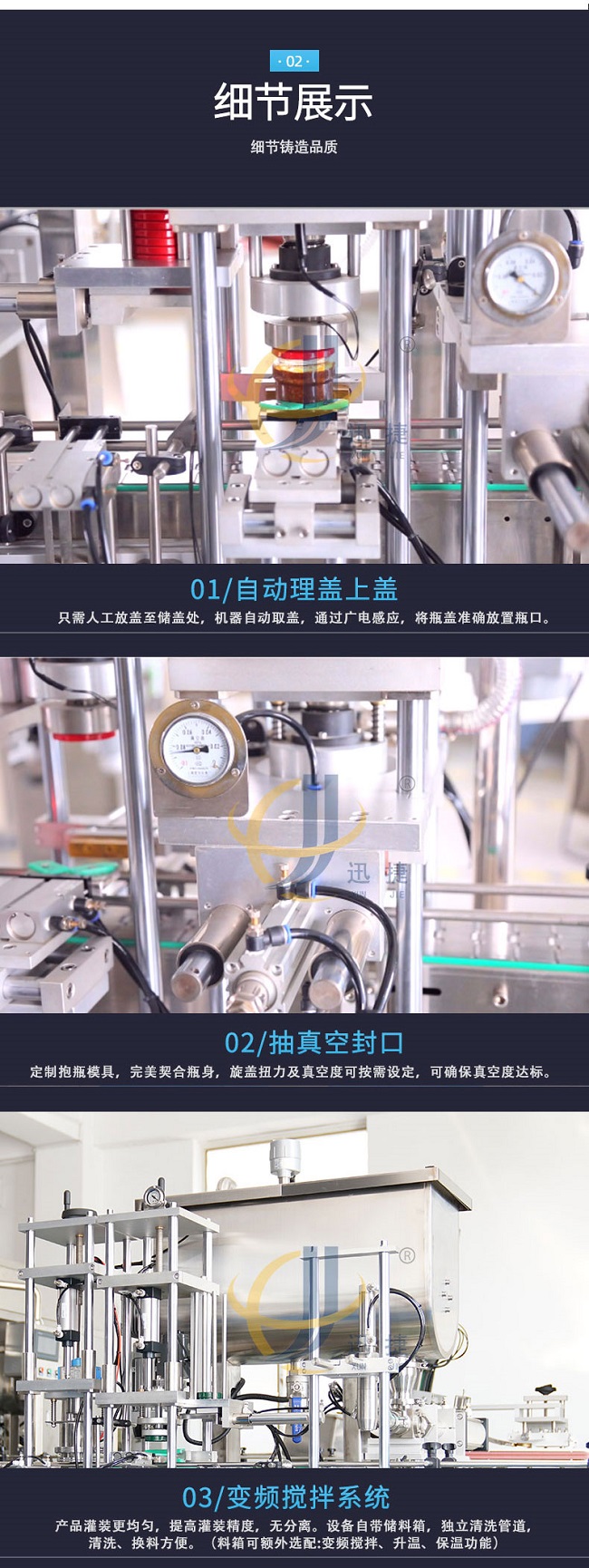 迅捷机械加工设备齐全,技术力量雄厚,选用德国PLC控制系统、台湾AirTac的气动组件和台湾伺服的电控组件,从这几个部件可以看的出来全自动牛肉酱灌装机改善的不仅是质量,生产效率和产品的外观包装,还会不断的引进国际上新的科学技术,全自动牛肉酱灌装机用更好的质量满足生活的需求。在自动化生产日渐普及的今天,全自动牛肉酱灌装机让企业的商品以更快的速度出现在市场中,毕竟一些繁杂的工作让人工去完成的话不但麻烦,效率也不会很高,想要适应现代化的大规模批量生产,就需要全自动牛肉酱灌装机的帮助来代替人工完成这些繁杂的工作。